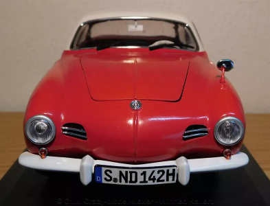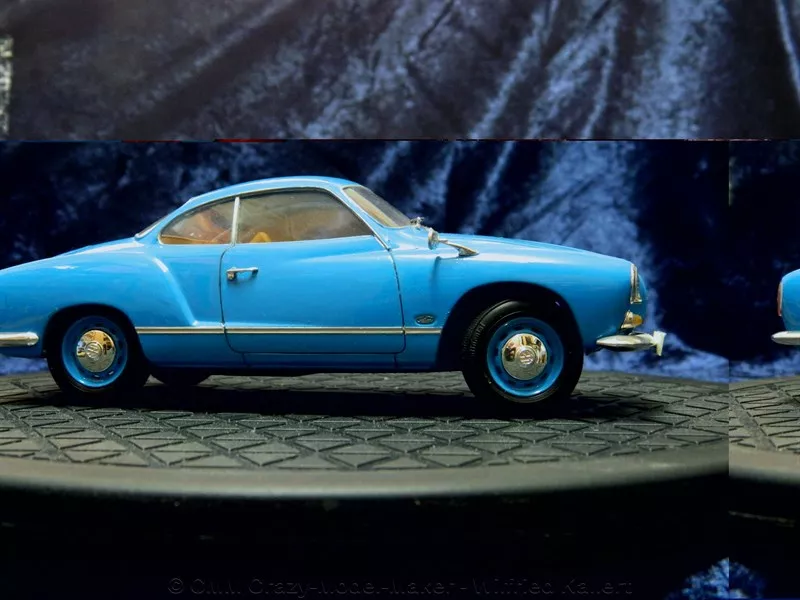 Auf Basis des Käfers entstand der Karman Ghia, eines italienischen Designers. Es sollte damit etwas mehr Sportlichkeit gezeigt werden. Tatsächlich war der Karmann, was den Sitzkomfort anging, angenehmer zu fahren, wie ein Prosche. Derzeit arbeite ich auch an einem Modell im größeren Maßstab 1:16. Dieses Modell in 1:25 ist einer meiner ersten Automodelle in diesem Maßstab.