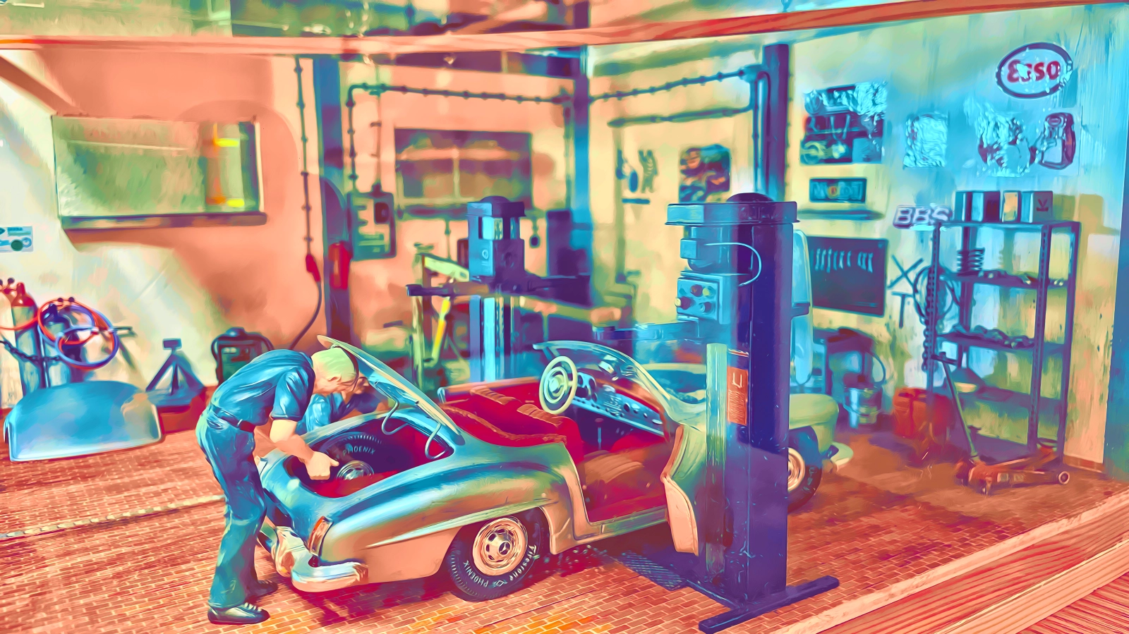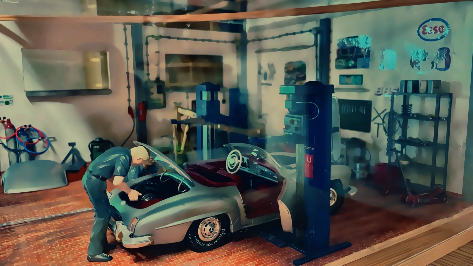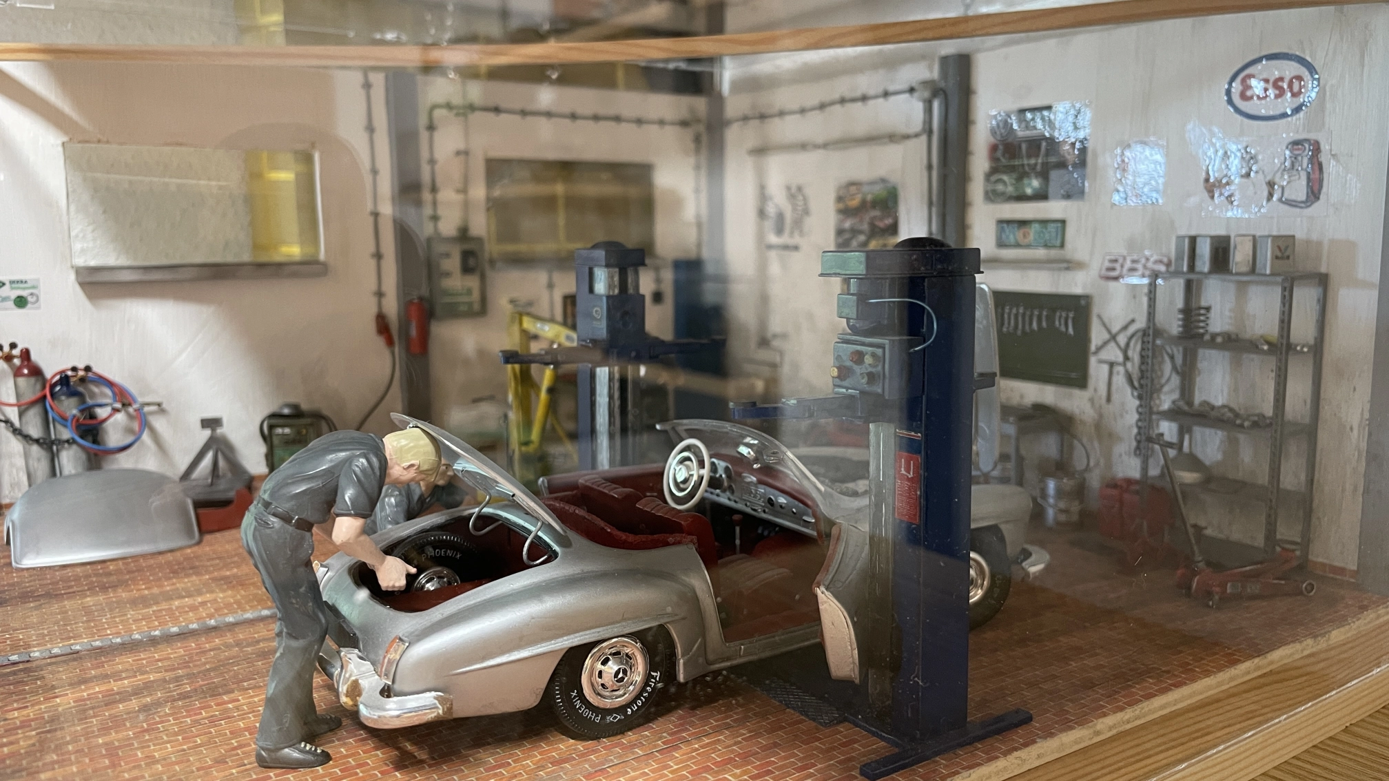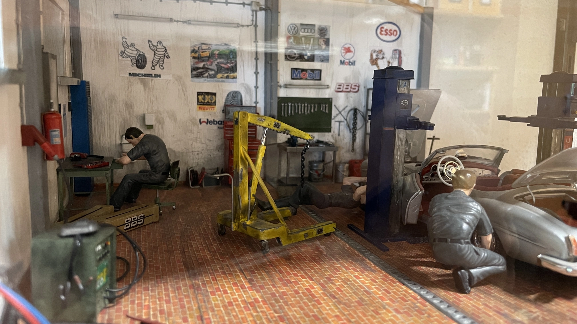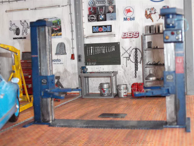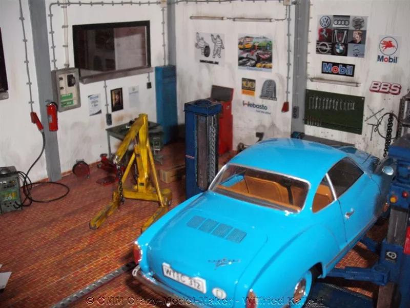 Natürlich darf eine Werkstatt nicht fehlen. Irgendwo müssen die Autos ja auch mal überprüft und repariert werden. Diese Fantasie-Werkstatt basiert auf einem Bausatz von Tamiya.
