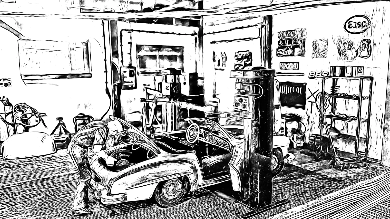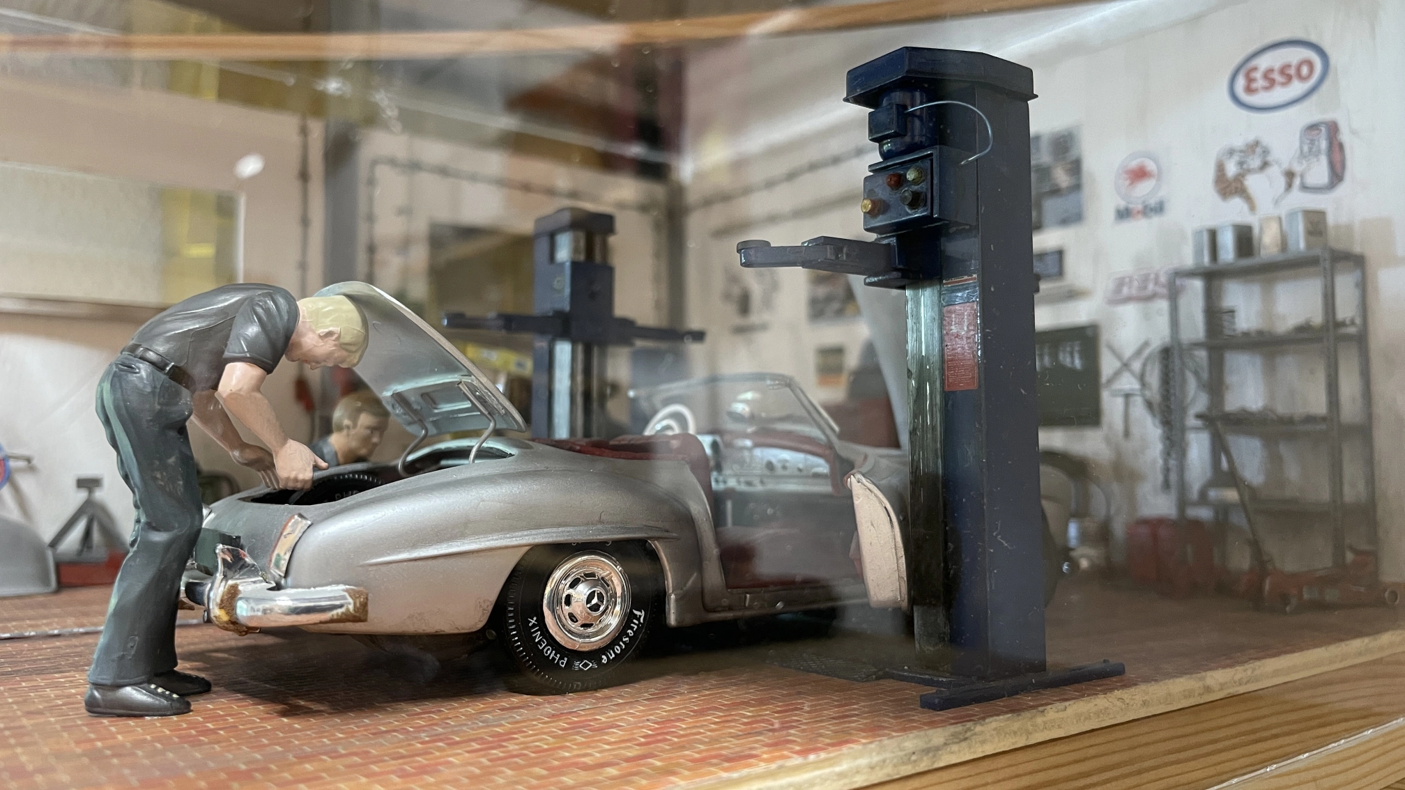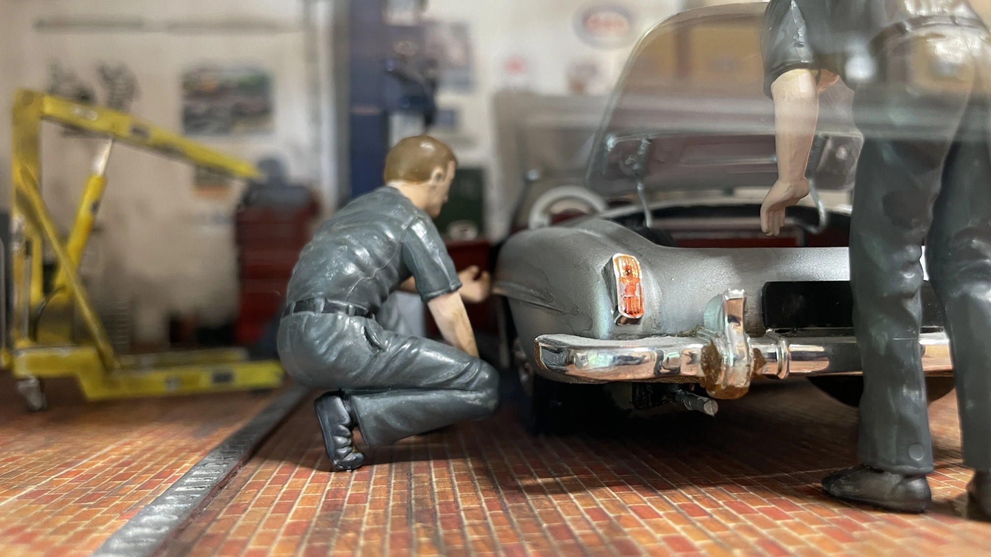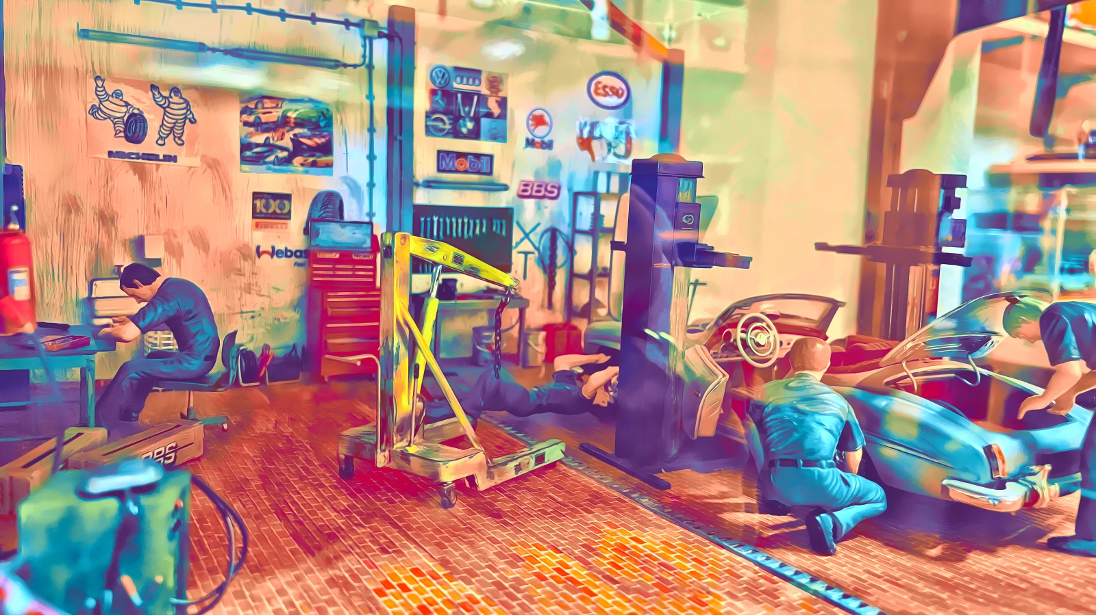 Natürlich darf eine Werkstatt nicht fehlen. Irgendwo müssen die Autos ja auch mal überprüft und repariert werden. Diese Fantasie-Werkstatt basiert auf einem Bausatz von Tamiya.